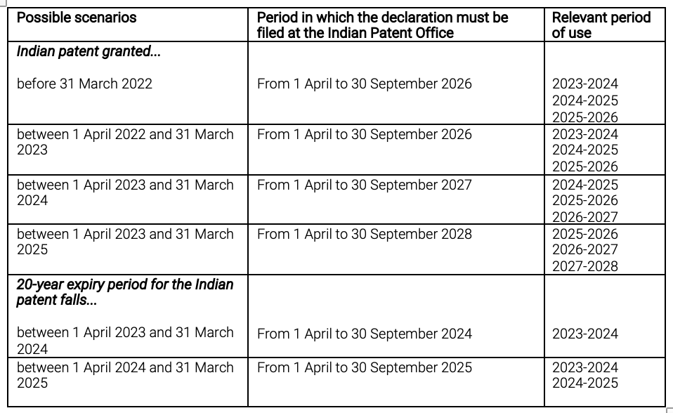 Declaration of use of patents granted in India or ‘working statements’ must be filed with the Indian Patent Office every three years, starting from the financial year immediately following the grant of the Indian patent and within six months after the end of each three-year period. The financial years run from April 1 to March 31 of the following year.