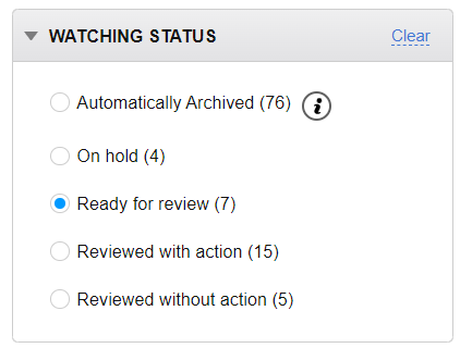- Watching status*: New watch notices can be found under ‘ready for review’, while sent and archived notices are now called ‘reviewed with action’ and ‘reviewed without action’ respectively. Users now also have the option to put watch notices ‘on hold’ for later review. Please be aware that the system will not archive ‘on hold’ notices automatically when the opposition deadline has passed (see visual).