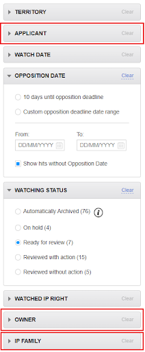 - Advanced filtering: Using the left-hand menu, users can now filter results by applicant, owner and IP family to quickly access relevant results and speed up the review process (see visual).
