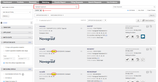- Advanced searching: Immediately highlight text in the applicant field by searching for specific text in watch notices (see visual).