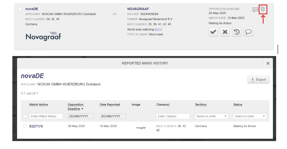 - Additional insights to inform decision-making: Quickly discover the history of a reported mark, using our new history icon. It opens a pop-up window detailing previous decisions, including all watch hits on the same reported mark with identical applicants. Data can be filtered and exported as required (see visual).