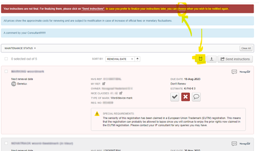 Trademark renewal decisions can require input from various internal stakeholders before they are officially sent as instructions to Novagraaf. However, pending instructions can sometimes be left unsent in our EasyIP system despite those renewal decisions being updated in our renewals module. To assist clients, we have added new ‘reminder’ functionality to this module to prompt users to take this final step.