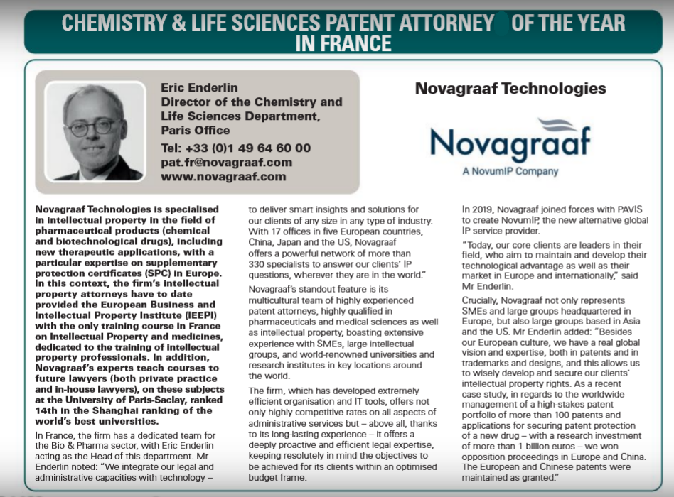 Nous sommes fiers de vous annoncer qu' Eric Enderlin, Directeur du département Chimie & Sciences de la vie du cabinet Novagraaf, et son équipe composée de Nadège Lagneau, Lise Pascual-Luciani,  Stéphanie Landais-Patarin, Adrien Metivet et Charles-Henri Bertaux, sont reconnus « Patent Attorneys of the year 2021 » (meilleurs spécialistes en droit des brevets de l’année) en France dans le domaine de la chimie et des sciences de la vie par Corporate INTL.