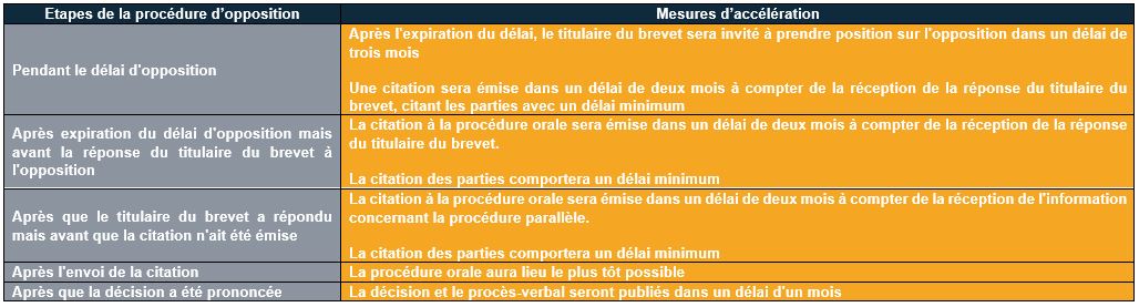 L’OEB a récemment fourni plus de précision suite à son communiqué du 7 novembre 2023 indiquant que la procédure d'opposition serait accélérée si l'OEB est informé par la JUB, une juridiction nationale ou une administration compétente d'un État contractant qu'une action en contrefaçon ou en nullité concernant le brevet faisant l'objet de l'opposition a été engagée. Pour mémoire, la mise en place de cette accélération de procédure a pour objectif de favoriser la sécurité juridique, l'économie de la procédure, ainsi que la qualité et la cohérence du système du brevet européen.
