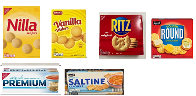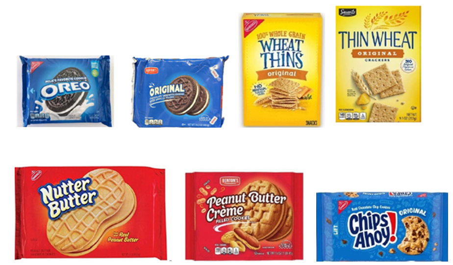 Net als de OREO verpakking, bevat de inbreuk makende Sandwich Cookie Verpakking een gestileerd koekje dat bestaat uit een witte vulling tussen twee zwarte koekjes met de markering met ribbels die een rand vormen langs de omtrek, die lichtjes naar rechts is gekanteld. Een overwegend blauwe achtergrond, die Mondelēz sinds 1952 heeft op zijn Oreo koekjesverpakking, met een lichtere blauwe halo rond het koekje. Hints van witte melkspatten. Een dik, schreefloos wit lettertype dat de productnaam aanduidt, dat Mondelēz sinds 1972 op zijn Oreo koekjesverpakking heeft staan, etc.